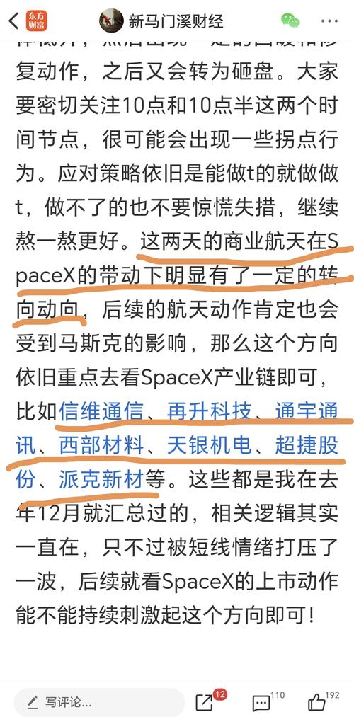 昨晚美大涨,我们这边高开基本没悬念。但弱势环境,高开少不了兑现,盘中观察兑现后谁最先回流。 如果指数最终是高开高走,今天和指数共振的方向就是接下来要重点关注的方向。 在缺量的市场环境下,指数无论是走修复还是走调整,都是有利于各个方向的抱团标的。 近期市场有持续性的分别是上周的锂电、创新药,和本周的航天,以及有可能走退潮的电力。 今天又出来了一个张雪机车和业绩预增线。 商业航天:正常是要迎来分歧,观...