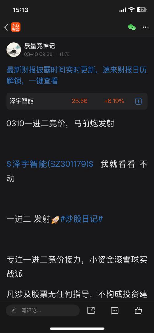 260310收盘,一进二复盘, $泽宇智能(SZ301179)$今日大盘这么好,还想挑战个创业板,很难,创业板晋级太难了,开盘涨幅2.53%,收盘6.19%,能拉起来算运气不错了 $群兴玩具(SZ002575)$另外给吧友小兄弟单独发了一个这,也是挺给力,再次感叹运气也太好了吧