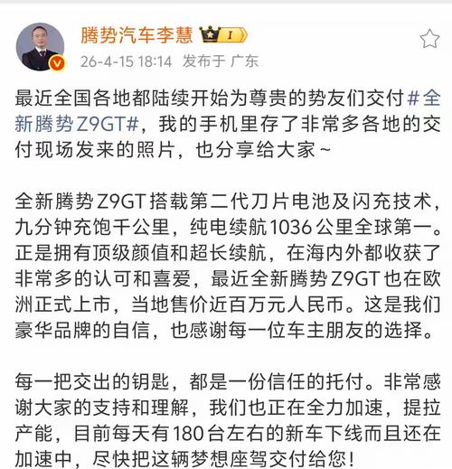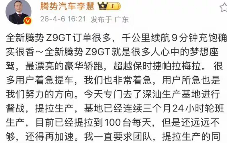 比亚迪产能狂飙:Z9GT十天暴增80%,订单多到老板蹲工厂催货!闪充太香,腾势今年靠三款车又要涨价又要走量 你敢信?一辆30万级的国产猎装车,现在竟然要等一个半月才能提车,而且这事儿还上了投诉榜!腾势Z9GT到底有多火?就这么说吧,连腾势的总经理李慧都被逼得亲自跑到深汕工厂去“蹲点”了。4月6日那会儿,一天只能下线100台,结果到了4月15日,这个数字直接飙到了180台——10天时间产能暴涨80%...