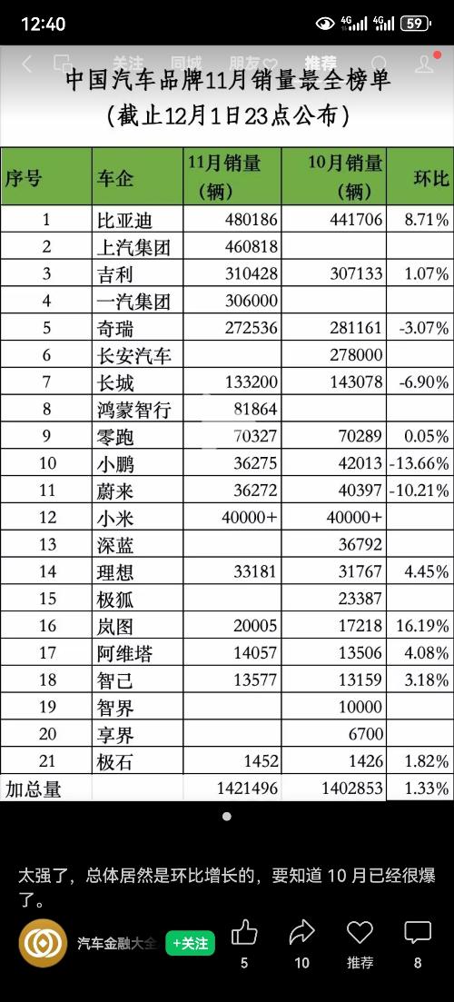 $比亚迪(SZ002594)$这个图,把比亚迪的优势展现的比较具体。所谓强者恒强,以技术创新为基础的比亚迪,不仅在营收上会增加,在利润额和利润率上,也是优势明显。也就是说,十一月总销量较10月份增加2万台的情况下,比亚迪全球销量增加了4万台。在吉利、奇瑞、零跑还在卷性价比的时候,比亚迪已经开辟了新营收渠道。