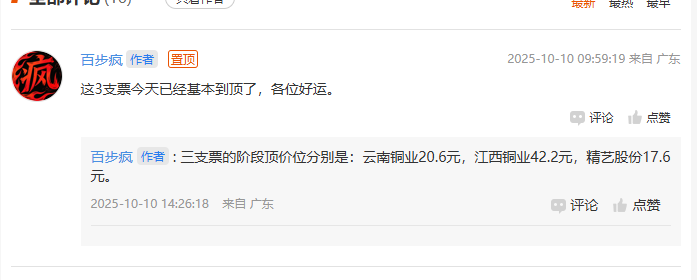 云南铜业,江西铜业,精艺股份 这3支票上周五(10月10日)就在解析买点的帖子里,顺便置顶发帖预报了阶段顶价位分别是:$云南铜业(SZ000878)$20.6元,$江西铜业(SH600362)$42.2元,“精艺股份”17.6元。有兴趣的浏览这篇文章: 【江西铜业】最佳短线买点揭秘,主力最怕你知道的真相 领益智造,万向钱潮,大族激光 这3支票9月30日就发帖预报已经到顶,分别是:$领益智造(SZ002600)$...