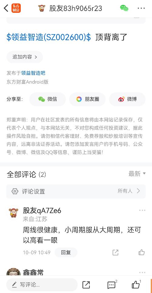 $领益智造(SZ002600)$这是我10月9号发的帖子,当时想走的,有个老哥在下面评论了一句,觉得他说的还是有道理的,没走。结果接下来的事情你们都知道了,被套住了这么久,今天终于解套了。两个结论:1⃣股市没有后悔药卖。2⃣对自己的资金负责,对自己的股票负责,别人只能影响而不能决定你的操作。 且行且珍惜,看好2600市值破2000亿。