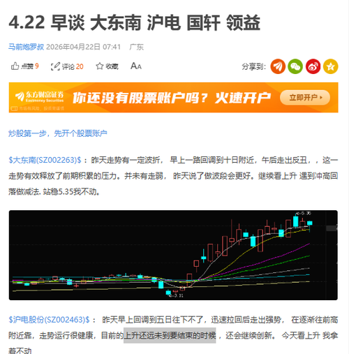 昨天看法一致 $大东南(SZ002263)$:昨天我已出,看市场是否转强,如站稳4.9可以进,做波段很舒服,继续走弱到4.7我就不考虑 $领益智造(SZ002600)$:昨天形成两阳加一阴反包,已经走出强势,上15.46站稳就要走加速。我看上升,继续拿稳 $沪电股份(SZ002463)$:昨天走势在我的预料之中,上升还远未到要结束的时候,接下来继续创新的概率大。我拿着不动 国轩高科:昨天冲高遇阻回...