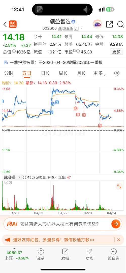 4.24早市前瞻:领益智造半年线处话多空。 如你所见,领益智造半年线14.71元连续四天剧烈震荡,多空势均力敌。 正如昨天领益主力下杀“诱空洗筹”小阴报收,技术失守半年线支撑。 领益智造,技术弱势原因很简单,即:机器人板块个股整体弱势。 机器人个股极端弱势,背离大盘4100点一线强势运行,如拓普集团5连阴。 因此,相对大盘4100点强势,机器人板块个股依存“强烈补涨”要求。 结论:机器人风口即刻开...