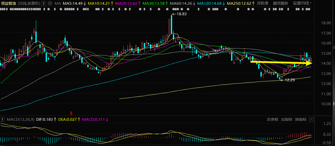$领益智造(SZ002600)$这票现在“想浪又有点怂”,处于“大腿拍肿想上车,又怕刹车踩油门”的阶段。布林带上轨(15.08)是它眼前的小目标,就看能不能一口气冲过去了。 股价:14.44元。 支撑位(底线):14.20元附近(10日线位置)。只要不跌破这儿,就安全。 压力位(天花板):14.68-14.77元(120、150日线)。冲过去,一片坦途看15.08元(布林上轨)。 成交量:今天10...