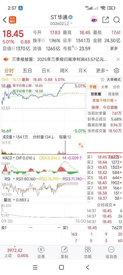 $ST华通(SZ002602)$高位顶部下跌股,一切下跌拉升过程只为主力能卖个好价,一切只为小散安心接盘。一个季度增加5万小散来接盘,主力做得很成功了,小散赚钱主力亏钱只有小散梦里有! 跌停时几十万手封单!因为主力大赚不怕别人买了去,正急着出货那!! 涨停时才几万手封单!主力怕被人偷家把高价股卖给他,目的是为拉高出货,吸引韭菜买进! 我说的是事实,我猜到有反抽所以今天也买点,打算咬一囗就跑!! 从...
