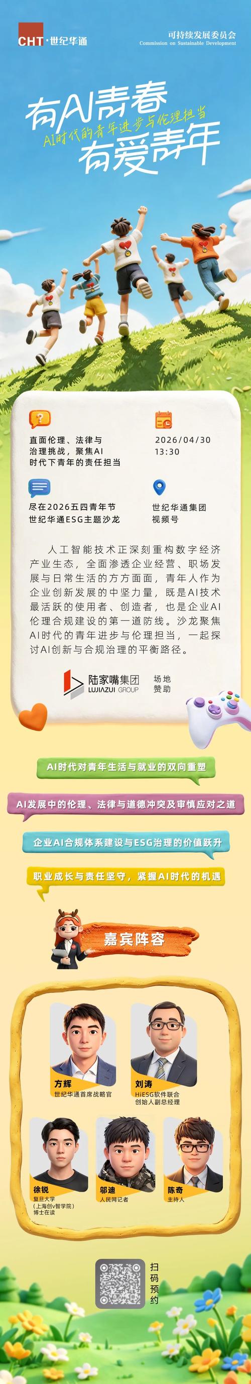 走出公司,登上坐落在上海张江人工智能创新小镇科学之门A塔的巅峰——世纪华通的“惯例”五四青年节ESG主题沙龙(第五季)即将到来! 当AI全面渗透产业与生活,青年群体既是技术创新的核心力量,也是AI伦理问题的第一道防线。在2026年五四青年节即将到来之际,世纪华通将于4月30日举办“有AI青春,有爱青年”ESG主题沙龙,活动聚焦AI时代的青年进步与伦理担当,邀请企业高管、媒体记者、青年学者等多领域嘉...