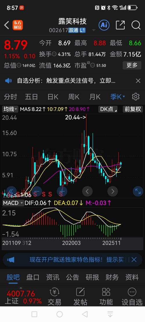 $露笑科技(SZ002617)$季线拐头马上第一根红柱柱了