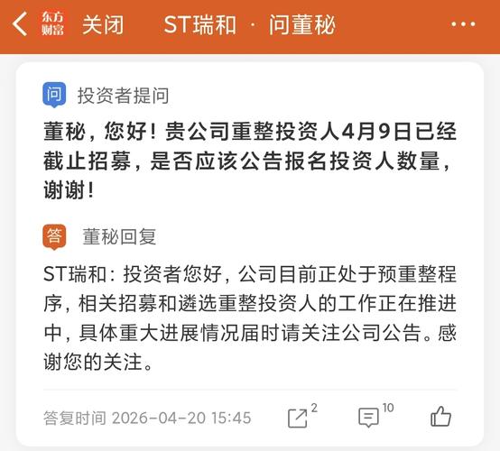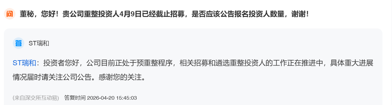 【问】董秘,您好!贵公司重整投资人4月9日已经截止招募,是否应该公告报名投资人数量,谢谢!【答】ST瑞和:投资者您好,公司目前正处于预重整程序,相关招募和遴选重整投资人的工作正在推进中,具体重大进展情况届时请关注公司公告。感谢您的关注。