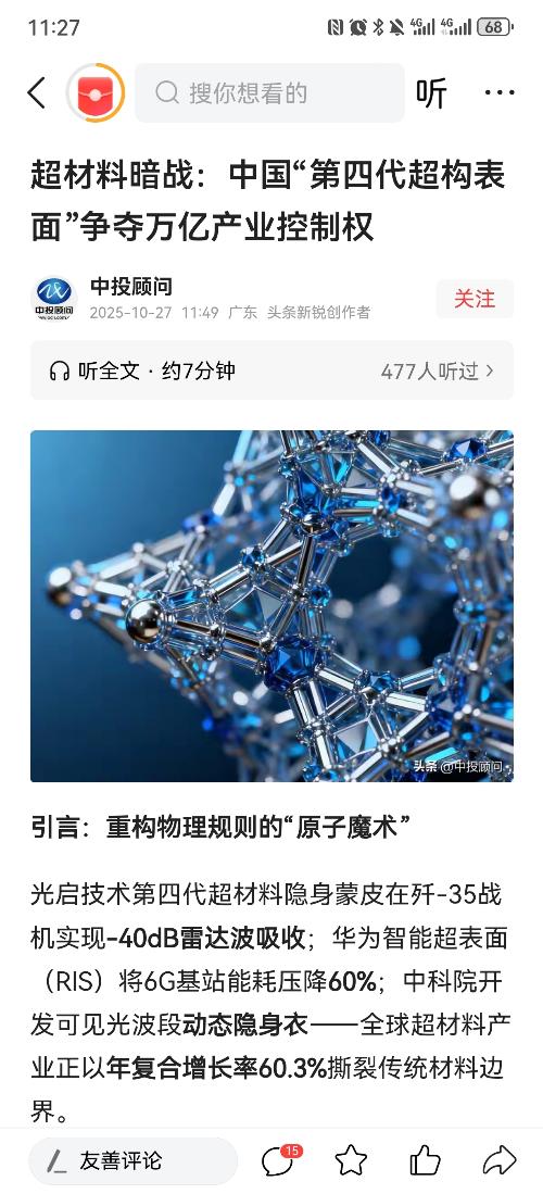 在现代空战的变革浪潮中,一款代号“玄龙”的无人机正以其颠覆性的技术,重新定义未来战场的规则。这款由我国自主研发的GJ-11无人机,融合了光启技术的超材料隐身科技与先进人工智能,成为当之无愧的“隐形终结者”。 一、“玄龙”的隐身利刃$光启技术(SZ002625)$的黑科技加持 光启技术的超材料隐身技术,为“玄龙”GJ-11打造了极致的隐身能力。其雷达反射面积仅为0.0001平方米,堪比“空中壳郎”...