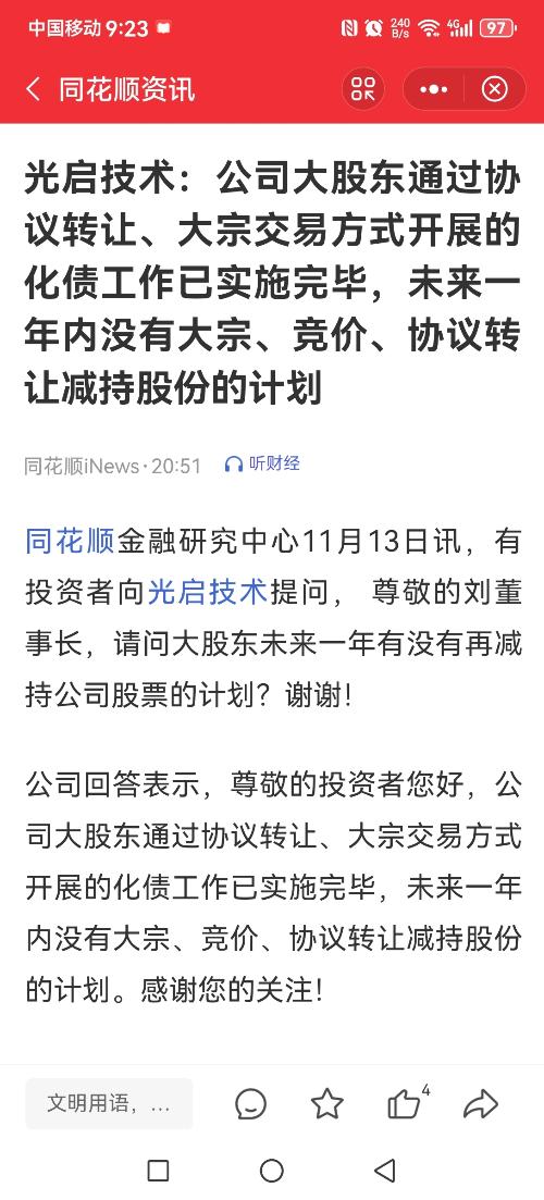 $光启技术(SZ002625)$光启技术大股东和管理层的小心思:11月4日公告称目前没有减持计划,在一片质疑声中昨天以采访形式被迫称一年内不减持,已经减持上百亿了,完全可以数年内不减持的,非不讲!第二点是,光启空间是光启科学的子公司,刘若鹏9月4日刚减持光启科学,现在还持有其股份,9月10日才辞去执行董事职务,光启空间从11月10日开始减持刘董事长在群里都承认了的,而有些人硬说光启科学与光启技术没...