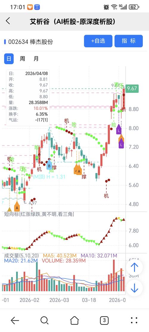 红绿小圆点是艾析谷的量化指标-艾短波,是趋势跟踪+突破类的量化指标,完全免费。 机会:股价上穿艾短波或绿变红、红字; 风险:股价下穿艾短波或红变绿、绿字。 图中A、B、L、H关注标记是对应AI选股模型当天下午2点多给出。 想多了解,问百度AI大模型,艾析谷。 AI模型选股,量化指标识别关键点,简单技术分析确定买卖点,结合量化和人工综合运用,才能有优势。棒杰股份 重点关注红绿转换,绿表示风险