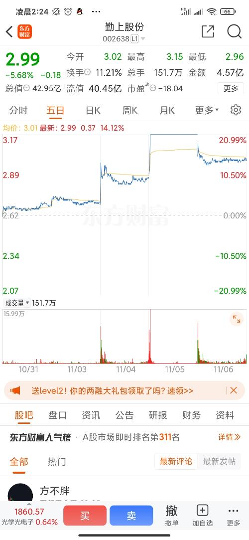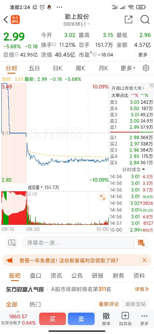 $勤上股份(SZ002638)$抄底失败了,但是我突然有了个想法,如果等每天稳定织布以后,高一分钱卖出,低一分钱买进,是不是意味着天天有的赚??就像今天3块卖出2.99买进