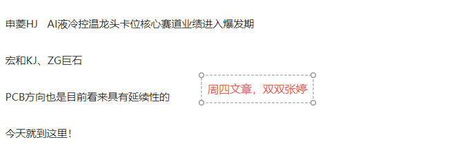 周四文章点化的$申菱环境(SZ301018)$两日拿下14个点 PCB方向的$宏和科技(SH603256)$和$中国巨石(SH600176)$ 左拥右抱双双张婷 还有昨天文章的华工KJ 鹏辉NY 目前市场上“含储量”最高的电池标的之一 全球储能电芯出货量中位居前十 泽润XN 光伏与新能源汽车双轮驱动 国家级专精特新“小巨人”企业 晶科KJ 绿色电力和储能 深度布局了算电协同 A哥窖藏 华工KJ 一...