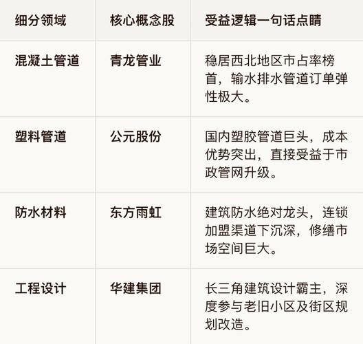 2026年作为“十五五”规划的开局之年,中央财政对城市更新的支持力度不仅没有退坡,反而进一步向“惠民生、补短板、促投资”的核心领域倾斜。国家专项资金正重点投向地下管网改造、老旧片区提升和城中村危旧房盘活。 简单来说,这不再是一句空洞的口号,而是带着真金白银的“实锤利好”。以下是为您梳理的3条核心受益主线及10大代表性标的: 主线一:地下“大动脉”建设(基建管材与防水) 这是中央财政资金到位最明确、...
