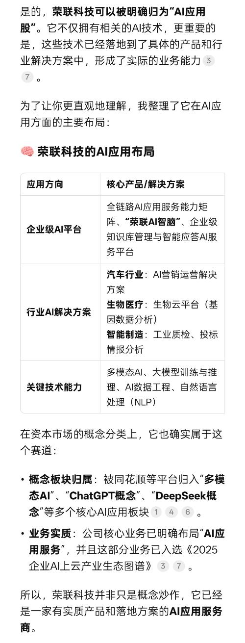 $荣联科技(SZ002642)$是的,荣联科技完全可以被视为一只AI应用股。公司已明确将AI应用服务作为核心业务板块之一,并推出了多项成熟的行业解决方案。 以下是支持这一判断的关键事实: ·核心定位:布局算力服务、数据服务、AI应用服务三大业务板块,AI应用是核心支柱之一。 ·产品落地:已推出企业级AI知识库、AI大模型推理一体机、AI智能导诊系统、车企AI营销运营解决方案等具体应用。 ·行业认可...