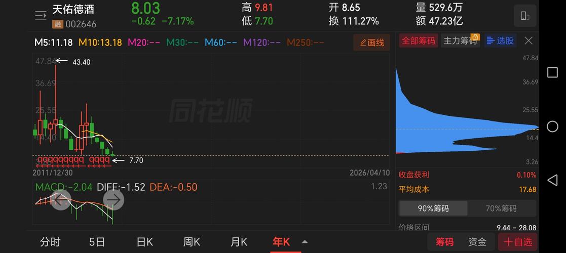 $天佑德酒(SZ002646)$只要你记住11.64到11.39元同8.8有两个跳空低开缺口就行。至于它什么时候回补上这缺口只是时间长短问题。任何一只股票都会回补缺口。以目前这个交易金额是可以抄底。何年何月回补上这缺口你就不理它。你当系买来做长期的价值投资。就算涨不到10元,涨到9块以上是100%没有问题的。