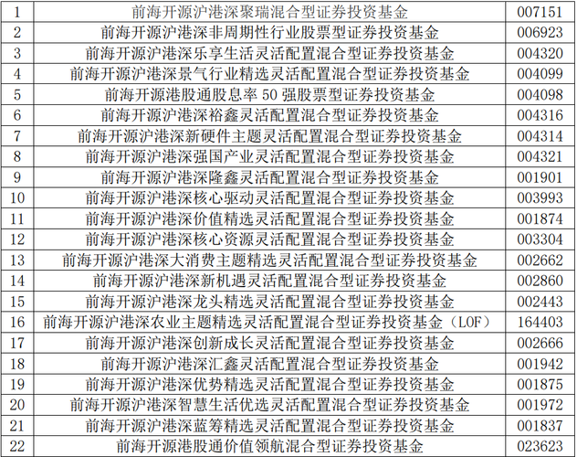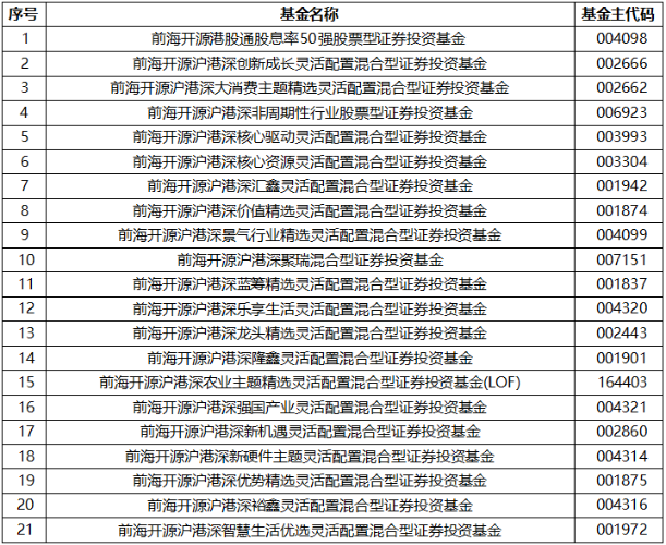 $前海开源港股通股息率50强(OTCFUND|004098)$$前海开源沪港深核心资源混合A(OTCFUND|003304)$$前海开源沪港深创新成长混合A(OTCFUND|002666)$$前海开源沪港深大消费混合A(OTCFUND|002662)$$前海开源沪港深非周期股票A(OTCFUND|006923)$$前海开源沪港深核心驱动混合(OTCFUND|003993)$$前海开源沪港深汇鑫混合A(OTCFUND|001942)$...