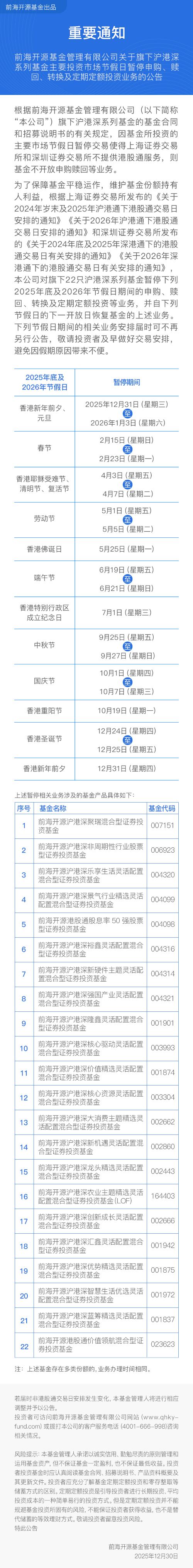 前海开源的家人们:因香港圣诞节期间不提供港股通服务,本公司旗下22只沪港深系列基金将于2025年12月24日(星期三)-2025年12月26日(星期五)期间暂停申购、赎回、转换及定期定额投资等业务,并于2025年12月29日(星期一)起恢复上述业务。持有沪港深基金的投资者,记得提前做好资金安排哦~具体内容详见下文的公告。根据前海开源基金管理有限公司(以下简称“本公司”)旗下沪港深系列基金的基金合同...