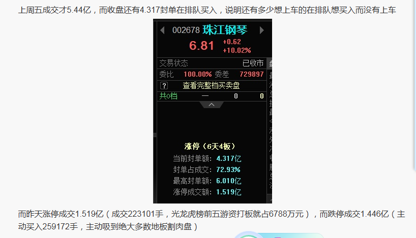 珠江钢琴能否成国企龙头大有能源之后的补涨龙头及龙虎榜详细解析 青云航线2025-10-2514:20|浏览906|评论29|加油0/0详情 珠江钢琴6天4板,上周五成交5.44亿、涨停成交1.519亿,最高封单6.01亿、收盘封单4.317亿。 再来瞧瞧当天龙虎榜上各席位详细买卖情况分析: 再瞧下各席位买卖的价位与多少 买榜一 在地板抄底极少,大部分打板买入,买入金额及位置如下图: 买榜二 竞价轻...