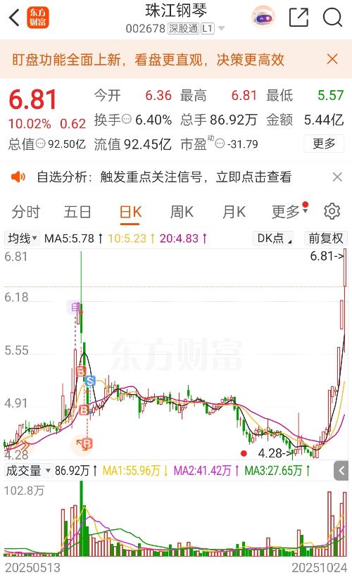 $珠江钢琴(SZ002678)$开盘7.27,最低6.26,收盘7.49