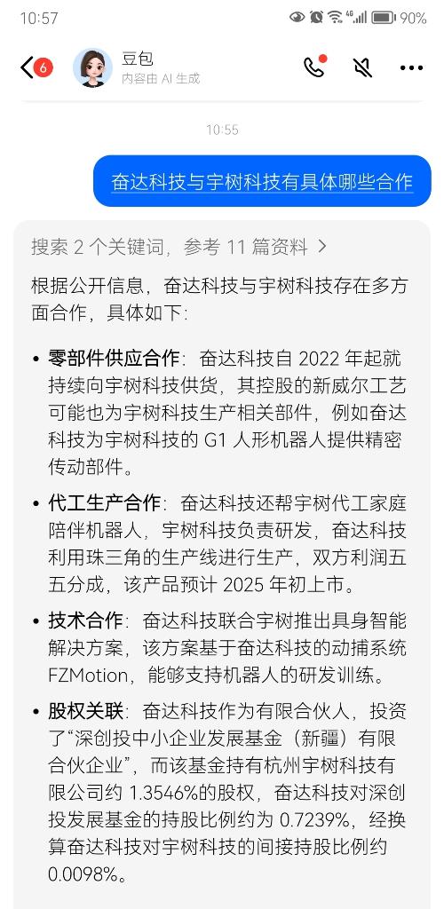 -与宇树机器人有业务往来[__LINK_ICON]:奋达科技通过私募股权基金间接持有宇树机器人极低比例(约0.0098%)的股份。此外,自2022年起,奋达科技作为供应商持续向宇树科技供货,其控股子公司可能为宇树科技生产相关部件。双方还曾联合推出具身智能解决方案,基于奋达科技的动捕系统FZMotion支持机器人的研发训练