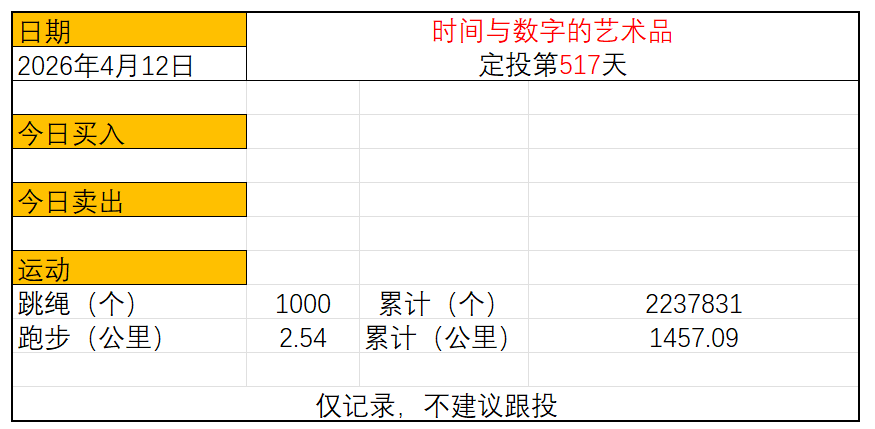 运动与投资第517天 2026年4月12日 今日定投: 周日,没有定投 跳绳:1000个,累计跳绳:2237831个 慢跑:2.54公里,累计慢跑:1457.09公里