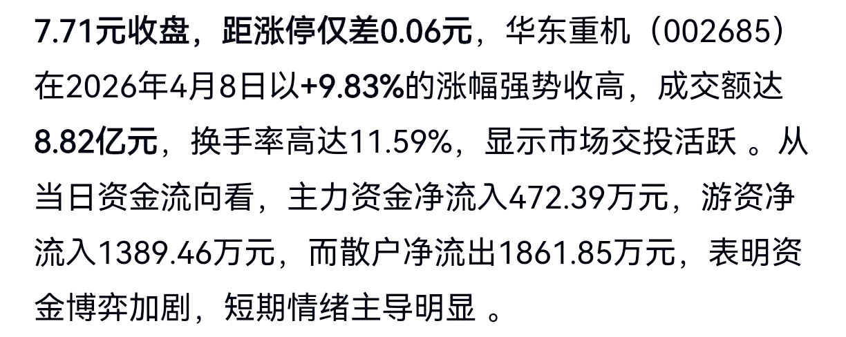 $华东重机(SZ002685)$今天散户净流出1861万元,只有散户在流出。主力净流入472万,游资流入1389万。散户被洗出去了
