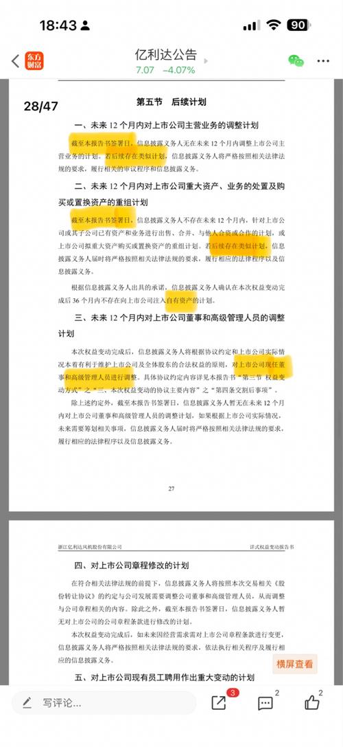 - 一、整句话的意思(一句话) 《浙江亿利达风机股份有限公司详式权益变动报告书(润桐控股)》原文第五节后续计划二分折截至今天,我们没有未来12个月内的重组计划;但如果以后有,我们会按规矩公告。” 二、逐句拆解(最清晰) 1. “截至本报告书签署日,信息披露义务人不存在未来12个月内……的重组计划。” 含义: - 只代表今天(2026.4.3),润桐控股没有制定、没有在谈、没有准备任何重组方案。 - 不是承诺12个月内不能做,只是现在没有计划。 关键点: - 这句话是事实陈述,不是禁止承诺。 - 明天、下个月、半年后想做,完全可以做。 2. “针对上市公司或其子公司已有资产和业务进行出售、合并、与他人合资或合作的计划,或上市公司拟重大资产购买或置换资产的重组计划。” 含义: - 指的是:卖资产、买资产、重组、置换、合作、合资等重大动作。 - 也就是:资产重组、资产注入、借壳、并购等。 3. “若后续存在类似计划,信息披露义务人届时将严格按照相关法律法规的要求,履行相应的法律程序以及信息披露义务。” 含义: - 如果以后突然有计划了,会公告。 - 意思是:我们现在没计划,但不代表以后没有。 三、这句话的约束力(非常关键) 1. 约束力:弱到几乎没有 - 只约束过去(签署当天确实没计划) - 不约束未来(未来随时可以变) 2. 不是承诺,不是禁止 - 不是“12个月内不许重组” - 是“现在没计划” 3. 12个月后自动失效 - 2027年4月3日之后,这句话完全没用。 四、通俗比喻(最容易理解) 这句话就像: “我现在没想好要不要买房,但不代表我以后不买。” - 不是承诺不买 - 只是现在没计划 - 明天想买就能买 五、对亿利达的实际意义(最关键) - 2026.4–2027.4(12个月内): 不会立刻重组(为了避嫌,避免被监管质疑)但不是不能重组。 六、最终结论(最精准) 这句话不禁止重组,不禁止注入,不禁止借壳。