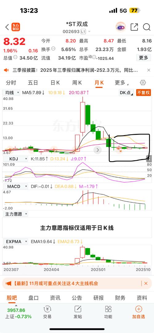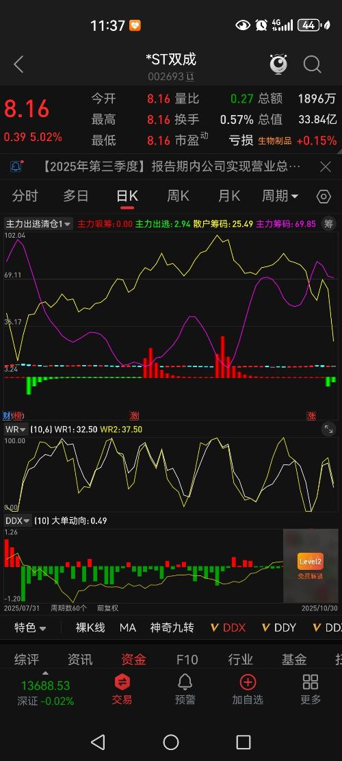 痴汉说股 更新于 10-31 18:13 412次浏览 $*ST双成(SZ002693)$我前面一直从业绩方面给大家分析双成药业,三季报净利润如期大幅增长,还是那句话,ST双城明年肯定摘帽。 今天,从技术方面分析一下。周,线,级别,双成药业,经过前面五浪级别下跌,在这里走了一个w底,本周股价成功站上了30日线MACD红柱加长,说明做多动能充足。 日线级别,近期底部放量明显,股价成功站稳。五日线,MACD站上零轴红色动能柱继续加长。上周主力明知道三季报走... 54