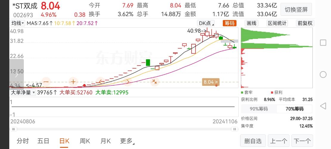 $*ST双成(SZ002693)$好怀念去年的双成药业重组从四块多涨到了四十,一字板开板后没敢追高错过了大妖,双成摘帽还能有一波大行情吧!
