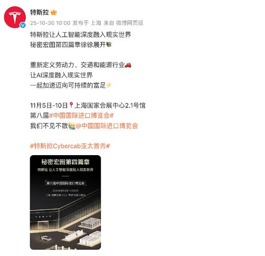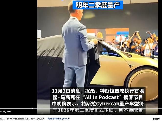 Cybercab11月5日进博首秀,无方向盘和踏板,明年二季度量产 Cybercab11月5日进博首秀,亚太首秀 无方向盘和踏板,明年二季度量产#无人驾驶出租车##无人驾驶# $万马科技(SZ300698)$无人驾驶出租车联网数据服务 $浙江世宝(SZ002703)$线控转向$亚太股份(SZ002284)$ 特斯拉无人出租车入华进入倒数!11月进博首秀,2026年或可一键呼叫 智驾星闻林工智驾星闻...