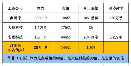 $*ST东易(SZ002713)$ Allbirds宣布转向计算基础设施,当天股价涨582%(截图1)。 这个世界算力成为最值钱的资产。 华著算力与估值分析(看图2):华著算力是奥瑞德的60倍、是大位科技的30倍、是宏景科技的30倍,华著借壳上市保守估值5000亿。目前东易(华著借壳)才144亿市值,也就是说保守计算有35倍上涨空间。 这样严重低估的st板块金凤凰,还有人卖?还有人砸盘?还有人喊筑...