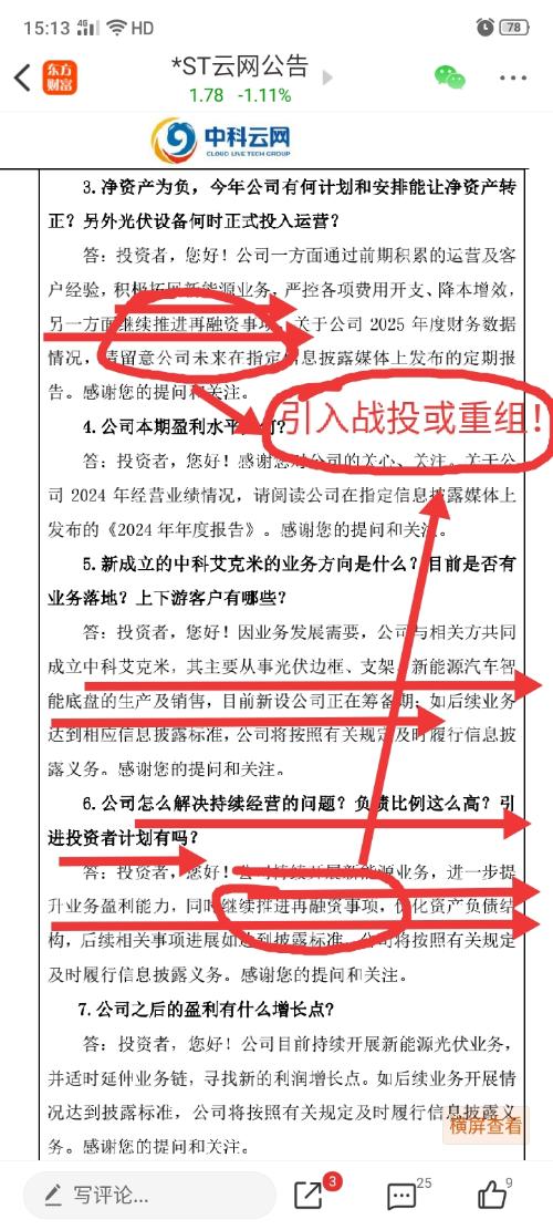 经过大妖师周密深刻思考,净资产转正除了我说的七条措施外,还有非常重要两条,发行股份并购重组!!!两种类型:第八,小型并购重组或叫简易并购重组,最快12个交易日完成!比如云网发行股份购买两国资旗下光伏或半导体资产重组,但不够成重大重组,董事会→股东大会→申请审批→执行,两个月足够了;第九,最后一条最好!也是与两国资(高邮国资和扬州国资)有合作基础的!国资入主重大重组+扬州科创5000万债转股或债务豁免3000万左右!两国资直接参与云网重大重组,发行股份购买他们旗下的优质资产(时间周期长3~6个月完成)!配套扬州科创5000万以债入股(扬州科创非常愿意啊!国资重大重组,股价猛涨!他以债转股也赚大钱!)或者豁免3000万以上债务!既保证了短期年报保级摘帽需要,又重大重组注入了国资优质资产,还彻底改变云网,做大做强云网!当然我们股东也大大受益!一举多得!之前底部横盘打压股价,是不是与发行股份并购重组有关?