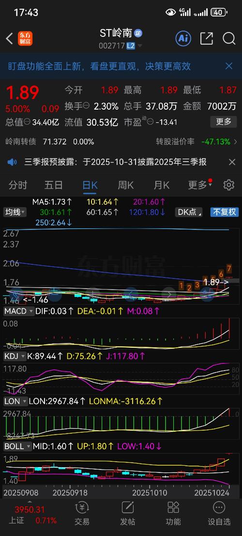 $ST岭南(SZ002717)$岭南这个趋势你让我卖出,你们想多了。这才那到那。一般我不发个股日线走势图,上一次是九月头发山子高科,结果山子20块多涨到多少我就不说了,买了多少也在帖子里有说。当然我已经出来了,所以才有有钱买岭南。
