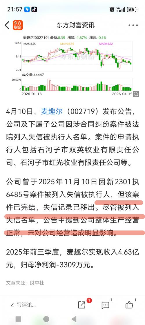 【麦趣尔及子公司被列入失信名单】4月10日,麦趣尔发布公告,公司及下属子公司因涉合同纠纷案件被法院列入失信被执行人名单。案件的申请执行人包括石河子市双英牧业有限责任公司、石河子市红光牧业有限责任公司等。 公司曾于2025年11月10日因新2301执6485号案件被列入失信被执行人,但该案件已完结,失信记录已移出。尽管被列入失信名单,公告中提到公司整体生产经营正常,未对公司经营造成明显影响。$麦趣尔(SZ002719)$...