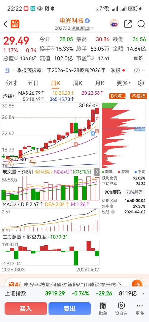 $电光科技(SZ002730)$ 今天高位震荡分歧,盘中也是强势向上反弹,创出了近期的新高,这个票走势是真妖啊,幸亏昨天高位减了半仓,否则底仓拿着还是挺难受的,很难抗的住他的波动,这个票走势问题不大,趋势还是强势向上运行,只要是趋势没有转弱,就继续格局,弱势环境下,这样的个股容易走出妖股的状态。