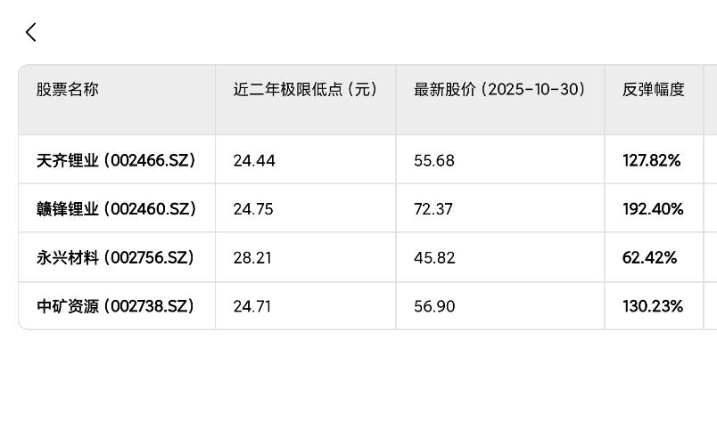 大调整是估值极限的试金石,近二年极限低点,$天齐锂业(SZ002466)$:24.44,$赣锋锂业(SZ002460)$:24.75,永兴材料:28.21,$中矿资源(SZ002738)$:24.71。目前最新股价:永兴材料45.82,天齐锂业55.68赣锋锂业72.37中矿资源56.90。 锂周期,一个美丽的梦想已经明确开启了