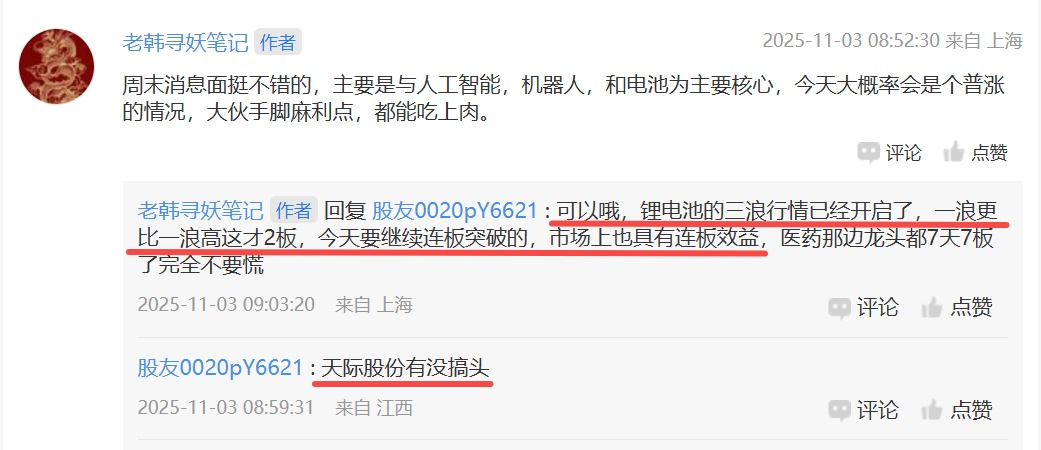 兄弟们,晚上好! 废话不多讲,直接说重点~ 1:指数这里两根阴线,跌多了涨,涨多了就跌,周一周二看反弹,短期震荡为主,长远维度依旧保持乐观。那如果短期走震荡的话,题材和投机就会好做一些,这里也不旗帜鲜明看好11月份走xx行情了,因为目前市场风格和指数绑定比较深,走一步算一步,根据指数的状态及时做切换。指数有走震荡的一个预期,那暂时就多往短线看一下,多做下题材或者抱团,指数什么时候有了走突破的预期,...