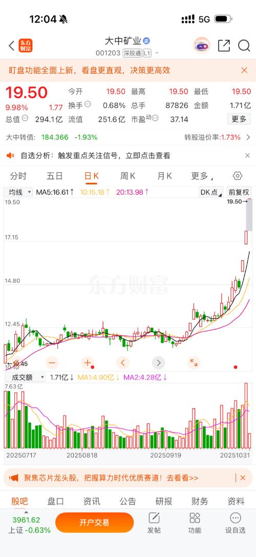 $大中矿业(SZ001203)$$天际股份(SZ002759)$$平潭发展(SZ000592)$昨天集合竞价公开推荐买入的大中矿业001203上涨趋势非常漂亮,加速上涨!