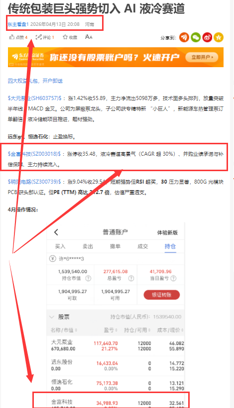 $大元泵业(SH603757)$:该标调整比较多,直接跌破了10日线,主力净流出8523万。 $金富科技(SZ003018)$:涨停收52.20,股价呈多头排列向上趋势,液冷赛道高景气(CAGR超30%)、并购业绩承诺与补偿保障、主力持续流入。东主4月13号开始布局该标,一直持有到现在,目前的利润比较客观,关注东主的朋友,也会默默吃到了肉。 $华源控股(SZ002787)$:微涨收17.67,公司...