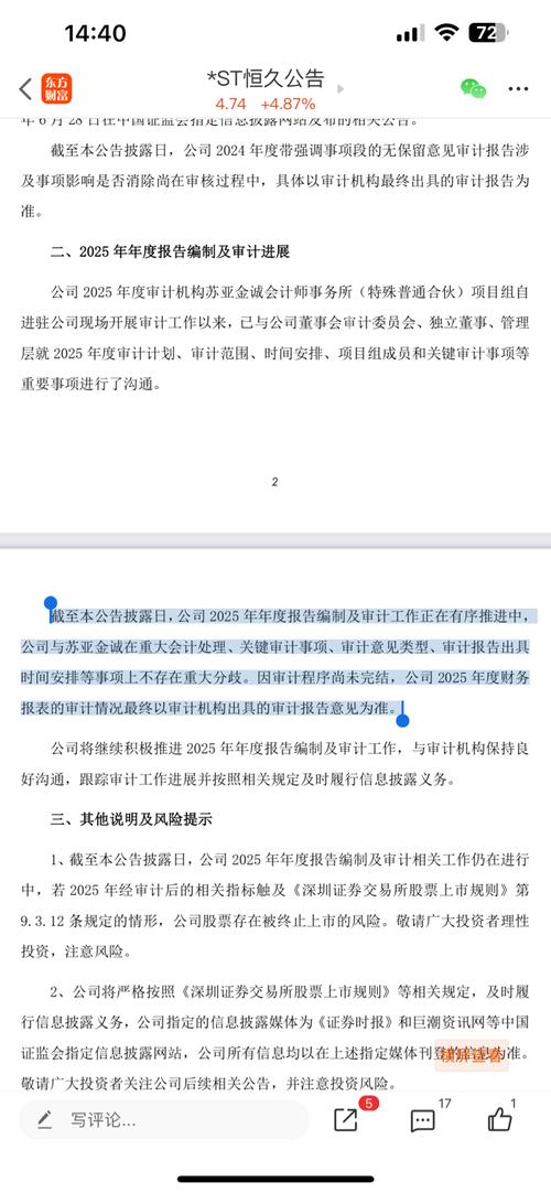 今晚*st花王公布了申请撤销退市风险的公告,公司审计已经提前完成,确认营收达标。恒久公司的进度有点慢啊!
