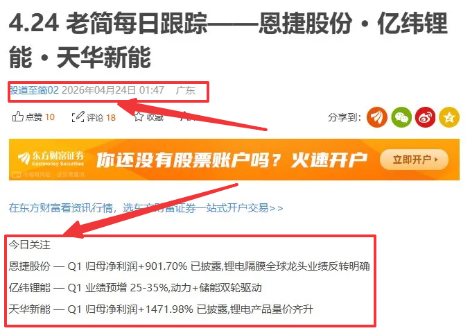 今日关注 恩捷股份—Q1归母净利润+901.70%已披露,锂电隔膜全球龙头业绩反转明确 亿纬锂能—Q1业绩预增25-35%,动力+储能双轮驱动 天华新能—Q1归母净利润+1471.98%已披露,锂电产品量价齐升 个人观点 三只都是业绩已经落地或明确预增的锂电产业链标的,覆盖隔膜、电池、锂材三个环节,是整个锂电复苏逻辑的核心敞口。 恩捷股份作为隔膜全球龙头,Q1净利同比9倍增长,业绩反转逻辑最清晰,...