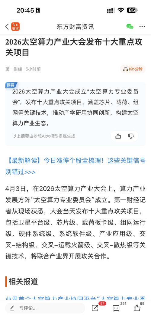 【2026太空算力产业大会发布十大重点攻关项目】4月3日电,在2026太空算力产业大会上,算力产业发展方阵“太空算力专业委员会”成立。大会当天发布十大重点攻关项目,包括卫星平台级、芯片级、载荷板卡级、组网运行级、硬件系统级、系统软件级、产业应用级、交叉-结构级、交叉-运载火箭级、交叉-散热级等关键技术,将联合产业界开展攻关合作。 一个板就行