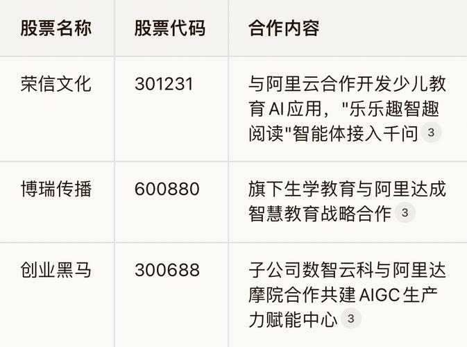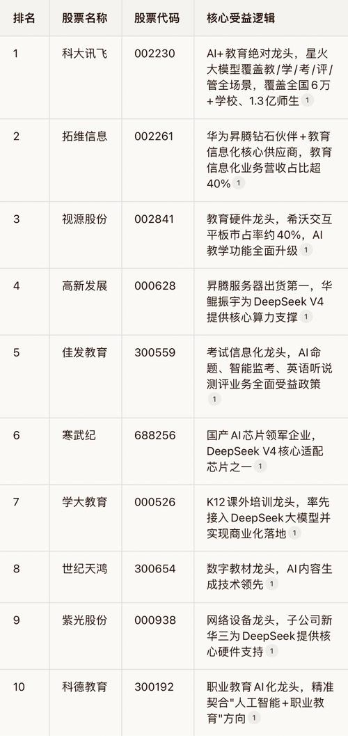 根据近期五部门联合印发的《"人工智能+教育"行动计划》以及市场相关分析,我为您整理了"人工智能+教育"相关概念股,主要分为以下几个类别: 一、政策核心受益股(按受益优先级排序) 二、其他重要概念股 三、与阿里合作的相关概念股 四、近期市场表现突出的概念股 根据2026年4月13日数据,以下个股今年以来累计涨幅超过10%: 高乐股份(002348) 世纪鼎利(300050) 勤上股份(002638)...