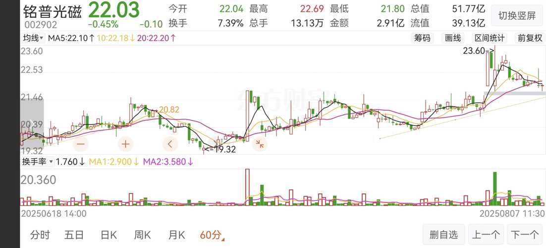 $铭普光磁(SZ002902)$收盘价预计21.7-21.8之间
