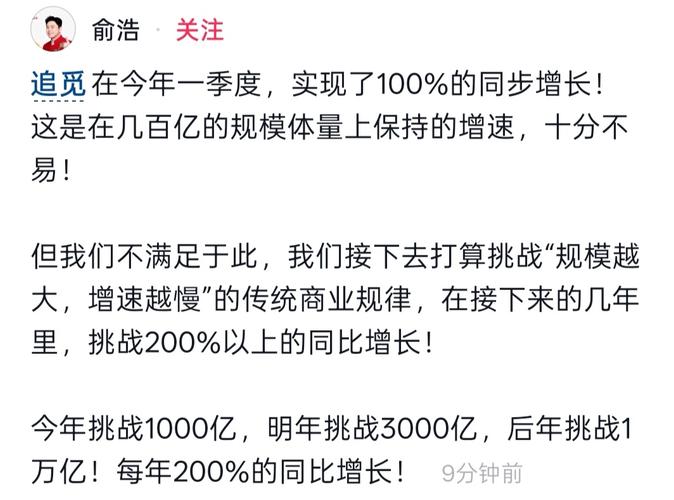 俞总发言了一季度增长100%今年1仟亿明年3仟亿后年1万亿目标