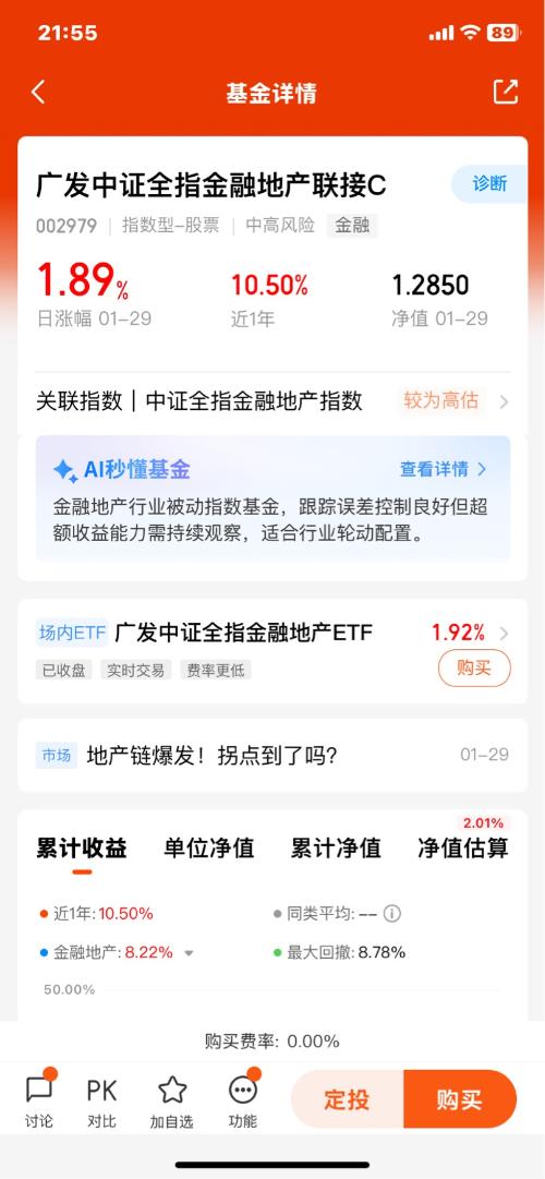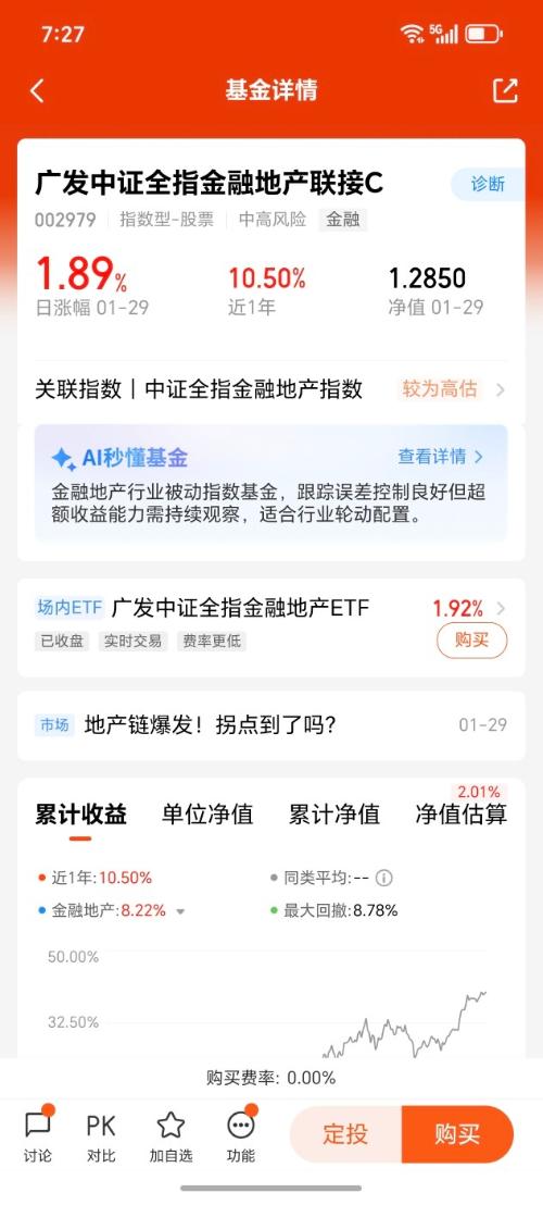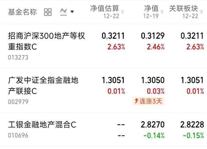 地产板块的上涨逻辑,全靠明年一些利好消息的预期支撑。这波行情估计还有持续性。现在板块走势特别被动,上周五早盘明明涨得很猛,结果到收盘有所回落,晚上更新净值有惊喜$招商沪深300地产等权重指数C(OTCFUND|013273)$上周五上涨2.46%,$广发中证全指金融地产联接C(OTCFUND|002979)$上涨0.03%,$工银金融地产混合C(OTCFUND|010696)$下跌0.14%。