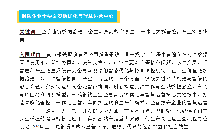 南钢:“2025中国智能制造十大科技进展”入围项目公示 工业互联说2025年10月25日 中国科协智能制造学会联合体开展“中国智能制造科技进展”研究,经过15家成员学会、智能制造领域内专家的推荐、遴选,现有10项科技进展成果入围“2025中国智能制造十大科技进展”(排名不分先后)。现将项目予以公示,公示期为2025年10月24日-10月30日。