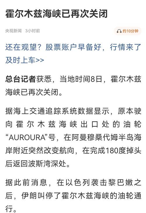 霍尔木兹海峡已再次关闭央视新闻约10,当地时间8日,霍尔木兹海峡已再次关闭。据海上交通追踪系统数据显示,原本驶向霍尔木兹海峡出口处的油轮“AUROURA”号,在阿曼穆桑代姆半岛海岸附近突然改变航向,在完成180度掉头后返回波斯湾深处。据此前消息,在以色列袭击黎巴嫩之后,伊朗叫停了霍尔木兹海峡的油轮通行。